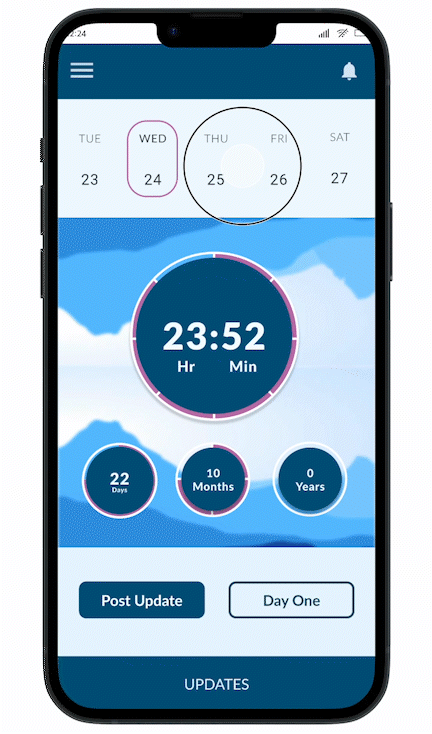 The idea of a Tolerance or T-break, came up multiple times. There would also need to be a short term goal function to cater to this. This need for short term sobriety tracking would be met by designing the central timer to have customizable versions for long and short term goals. This function not only separates Awake from the competitor capabilities but showcases its dedication to undertanding the needs of its users